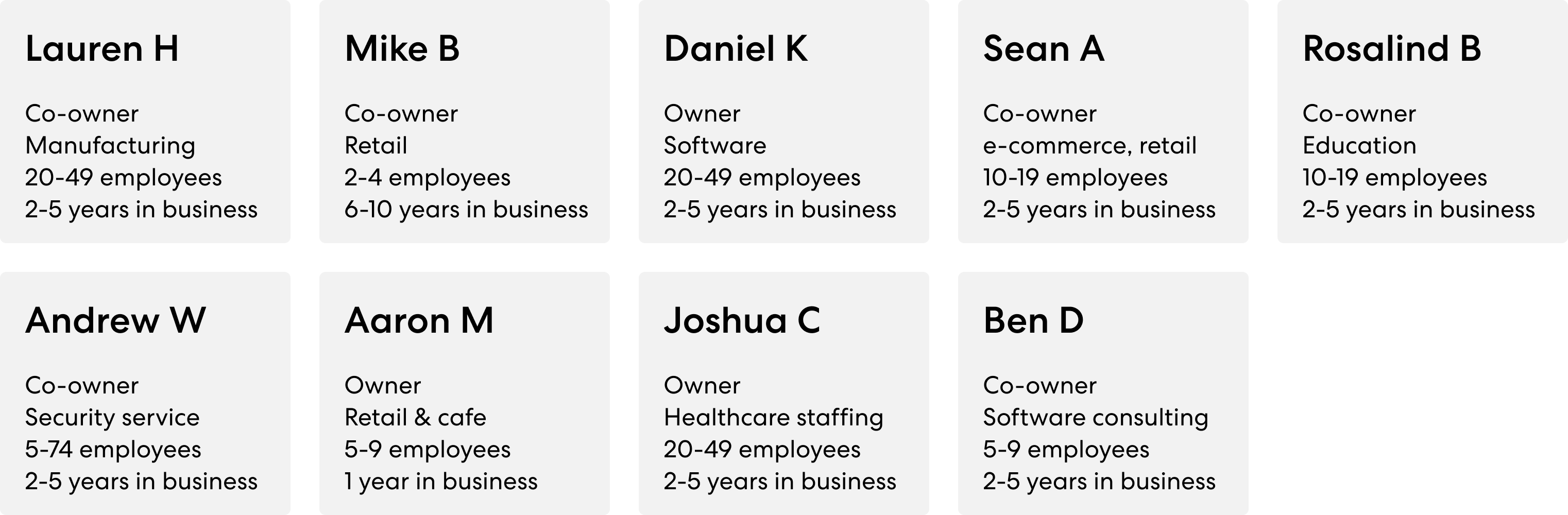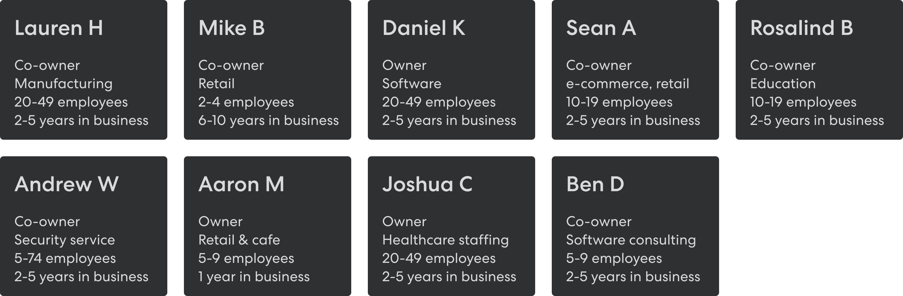 We ran 60-minute interviews with nine small business owners across manufacturing, retail, education, healthcare, and e-commerce. I worked with the product lead, another product manager, and head of user research to frame the research questions, observe sessions, and synthesize findings together.