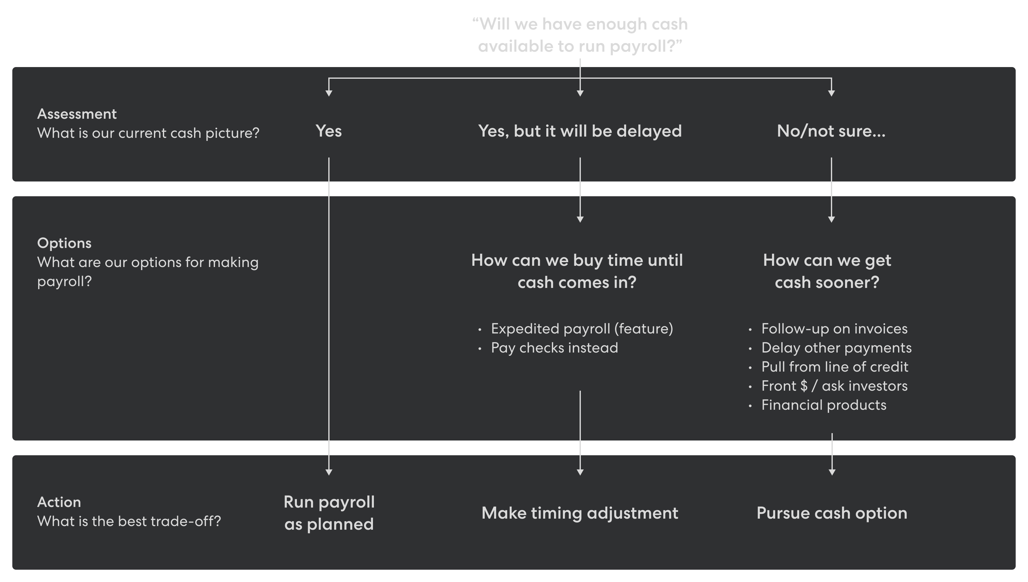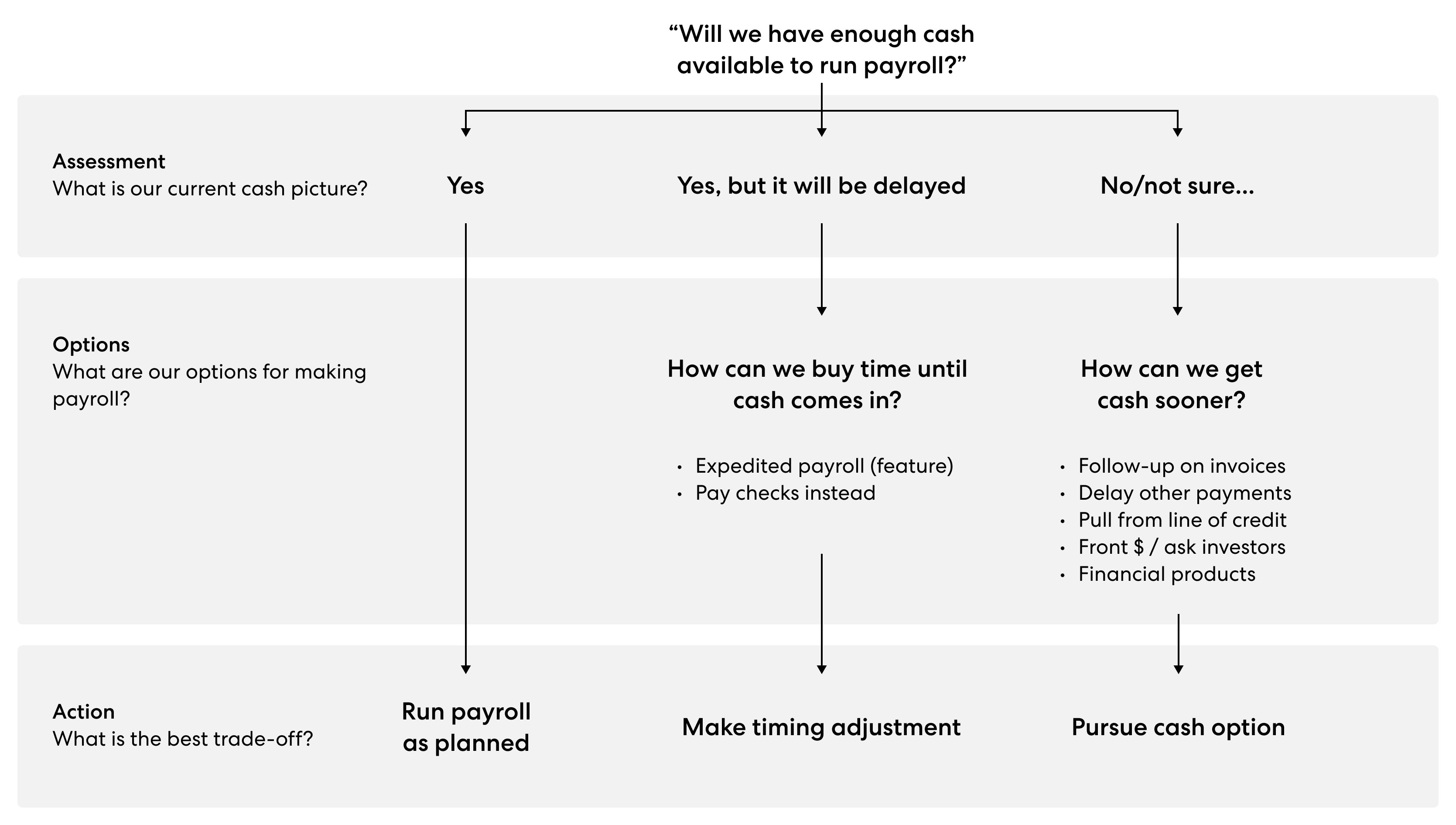 Before touching Gusto, they'd assess their cash position. If it looked tight, they'd run through options — expedite invoices, chase payments, delay vendor bills, pull from a line of credit. Only after working through all of that did they actually run payroll.